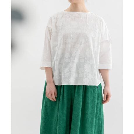 前後どちらでも着用可能のシンプルなノーカラーブラウス。ゆったりシルエットながらもジャストな袖丈で上品に着られます。オフホワイトとブラックは表情の違う同色テキスタイルの組み合わせ、ストライプはピッチの違う3種のストライプを使用しています。