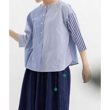 前後どちらでも着用可能のシンプルなノーカラーブラウス。ゆったりシルエットながらもジャストな袖丈で上品に着られます。オフホワイトとブラックは表情の違う同色テキスタイルの組み合わせ、ストライプはピッチの違う3種のストライプを使用しています。