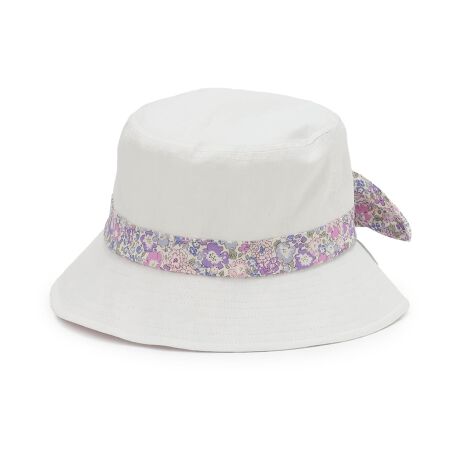 リバティファブリックスの花柄を取り入れた上品な印象の帽子です。後ろのリボンは広げると日除け布になり、首元をカバーできます。紫外線対策に役立つUVカット機能つきなのもうれしいポイント。すべり部分にはひんやりと感じる接触冷感素材を使用しました。内側にお名前を記入できるタグつき。