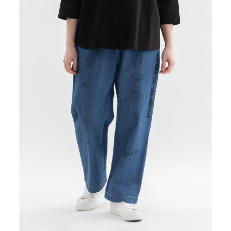 落書きのようなラフなモチーフをプリントしたパンツ。リラックスしたシルエットのジャストなフルレングス丈のストレートパンツで、高密度の程よく軽いコットンツイルと麻混のしっかりめのデニムを使用しています。右後ろのスワンネームやサイドの配色三角ステッチなどもさりげないアクセントを効かせています。ウエストゴム仕様で内紐つき、ウエスト裏の見返しと両サイドポケットの袋布はオリジナルのロゴプリント生地です。