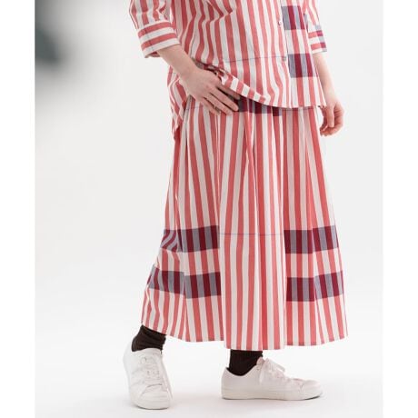 横ボーダーがアクセントになった太ストライプキュロット。太いストライプに一定間隔でボーダーを入れたオリジナル生地。個性的でモードな印象、コーディネートにダイナミックさやインパクトを与え、上級者向けの着こなしを演出します。スカート見えしながら活動しやすく、長めの丈で大人っぽい着こなしに。ウエストはゴム仕様、共紐の先についた六角モチーフもポイントです。両サイドのポケット口にはスカラップステッチ入り。
