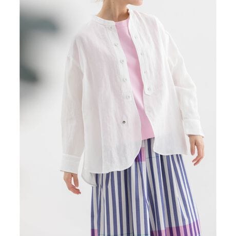 ヘンプのスタンドカラーシャツ。アンティークメンズシャツのような前立てデザインで両サイドにポケットつき。後ろはヒップが隠れる長めの丈です。フルオープンで羽織にも使えます。麻のシャツは夏は涼しく冬は暖かい、快適な1年中使えるシャツとして活躍します。