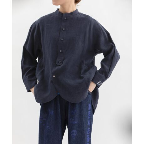 ヘンプのスタンドカラーシャツ。アンティークメンズシャツのような前立てデザインで両サイドにポケットつき。後ろはヒップが隠れる長めの丈です。フルオープンで羽織にも使えます。麻のシャツは夏は涼しく冬は暖かい、快適な1年中使えるシャツとして活躍します。