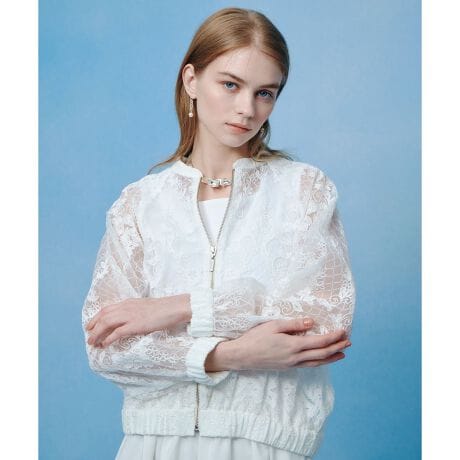 オーガンレースTシャツと同じ生地を使用したブルゾン。刺繍の総柄ですがシアー素材なので涼し気に羽織っていただけます。Tシャツ同様、裏側はチュールで始末しており、オーガンジー特有のチクチク感がなく ジップを閉めてトップスとしても着ていただけます。
