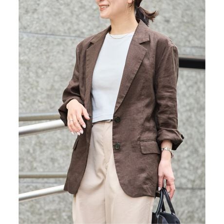 シャツやカーディガンよりもきちんと見えしつつもカジュアルにさらっと羽織れる使えるリネンジャケットです。