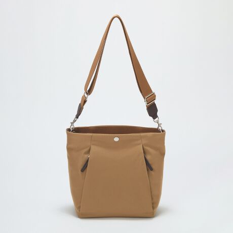 太めのショルダーベルトは肩へのあたりも優しく、長さ調整で肩掛けや斜め掛けも自在に。