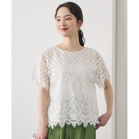 甘さを抑えた大人のパネルレースブラウス■デザイン身頃にパネル柄、袖に異なるスカラ柄を配した、デザイン性の高いプルオーバーブラウスです。素材のリッチな表情を引き立てる、シンプルなボクシーシルエットで仕上げました。肩まわりを程よくドロップさせた抜け感のあるフォルムで、Tシャツ感覚でさまざまなボトムと好相性です。レースの華やかさを活かした、コーディネートの主役になる一枚です。同素材のスカート(SKWMLM0407)と合わせたセットアップ風の着こなしもおすすめです。※画像はサンプルを使用しております。実際にお届けする商品は、前のみ着丈が4cm短くなり前後差が大きくなります。■素材幾何モチーフをグランドに、大胆な大柄のスカラップモチーフを配したパネルレースです。総柄のレースとは異なるパネルレースならではの柄行が華やかな印象ですが綿高混率で編み上げることで、エレガントになり過ぎない程よい表情感に仕上がりました。自由区オリジナルのレース素材です。■同素材スカート(SKWMLM0407)