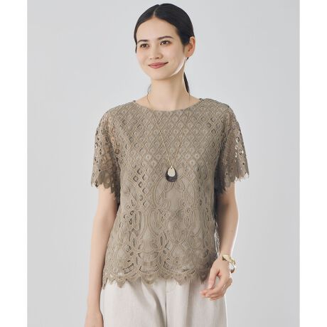 甘さを抑えた大人のパネルレースブラウス■デザイン身頃にパネル柄、袖に異なるスカラ柄を配した、デザイン性の高いプルオーバーブラウスです。素材のリッチな表情を引き立てる、シンプルなボクシーシルエットで仕上げました。肩まわりを程よくドロップさせた抜け感のあるフォルムで、Tシャツ感覚でさまざまなボトムと好相性です。レースの華やかさを活かした、コーディネートの主役になる一枚です。同素材のスカート(SKW7LM0407)と合わせたセットアップ風の着こなしもおすすめです。※画像はサンプルを使用しております。実際にお届けする商品は、前のみ着丈が4cm短くなり前後差が大きくなります。■素材幾何モチーフをグランドに、大胆な大柄のスカラップモチーフを配したパネルレースです。総柄のレースとは異なるパネルレースならではの柄行が華やかな印象ですが綿高混率で編み上げることで、エレガントになり過ぎない程よい表情感に仕上がりました。自由区オリジナルのレース素材です。■同素材スカート(SKW7LM0407)