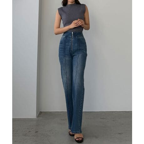 Louere ハイウエストファスナーデザインストレッチストレートデニムパンツ
