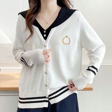 セーラーカラートップスとVネックカーディガンを重ねたようなおしゃれカーディガン。カジュアルながらトレンド感のあるスタイリングが一枚で完成するアイテム。顔まわりをすっきり見せるVネックライン。体にほどよく沿うコンパクトなシルエットでスタイルアップ。胸元のワンポイントやゴールドボタンがアクセントとなり、カジュアルな中にもさりげない洒落感をプラス。伸縮性があり着心地も快適、ロングシーズン活躍します。今っぽプレッピーカジュアルのスタイルがすぐに整う主役アイテムです。