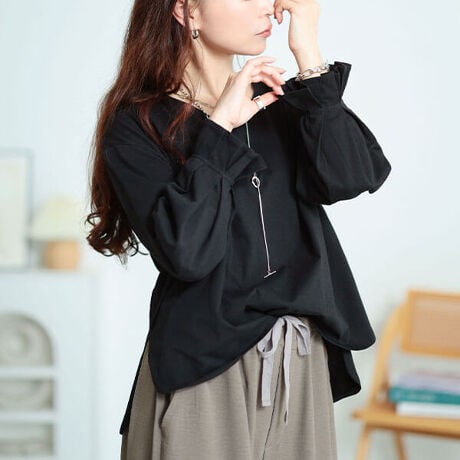 大人可愛い使えるシンプル☆タックスリーブVネックコットンプルオーバーゆとりのあるシルエットで楽ちん着心地♪前後差のある着丈で後ろは気になるヒップラインをカバーしながら前着丈は今旬クロップド丈で脚長効果抜群☆大人可愛いタックキャンディスリーブで二の腕もお洒落にカバーしてくれます♪大人の差し色に取り入れやすい豊富なカラバリは全色コンプしたくなる使いやすさ!