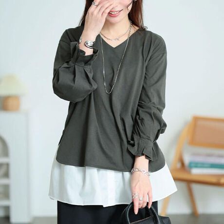 大人可愛い使えるシンプル☆タックスリーブVネックコットンプルオーバーゆとりのあるシルエットで楽ちん着心地♪前後差のある着丈で後ろは気になるヒップラインをカバーしながら前着丈は今旬クロップド丈で脚長効果抜群☆大人可愛いタックキャンディスリーブで二の腕もお洒落にカバーしてくれます♪大人の差し色に取り入れやすい豊富なカラバリは全色コンプしたくなる使いやすさ!