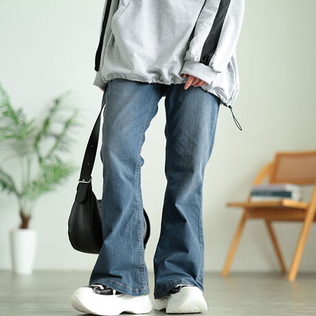 ブーツカットのフレアシルエットが、ベーシックなデニムパンツにレトロ感のある品の良さをプラス。カジュアルから綺麗めまで、幅広いスタイリングに馴染みやすく、ロングシーズン楽しめる一本。コットンメインのデニム生地だから、穿く程に馴染み、自分らしさを演出する味のあるデニム。裾に向かって広がるフレアシルエットで脚長&美脚効果に。すらっと伸びるレングスが穿くだけで美しいシルエットを描きます。ウエストの後ろ側にはゴムが配され、程よくフィットしながら、ストレスフリーな穿き心地。ストレッチが効いたデニムだから屈んでも窮屈感を軽減。