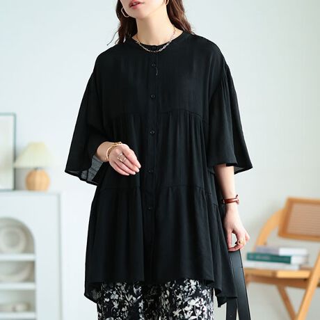 ティアードシルエットのたっぷりなフレア感が、愛らしい女性的シルエットを描くチュニック。シンプルながらも、シルエットで魅せる一着。大人スタイルにぴったりな色展開に、軽やかな生地で仕立て、爽やかな印象をプラス。デイリーからオフィスシーンなど、幅広い場面にマッチします。たっぷり生地を使用したティアードフレアのシルエットが、ボディラインをカモフラージュ。長めのフレアスリーブが女性らしさを加速させつつ、二の腕まわりを可憐にカバー&華奢見え。安心のチュニック丈だから、ヒップや腰・太ももをさり気なく隠してくれる頼れる一着。