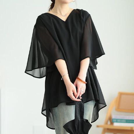 ふんわり軽やかなシフォン素材で仕立てた、フレアスリーブチュニック。揺れる袖のデザインが気になる二の腕を自然にカバーし、腕のラインをきれいに見せてくれます♪ゆったりとした身幅と落ち感のあるシルエットで、体のラインを拾いにくくリラックスした着心地◎さらりとした素材で肌触りも良く、軽やかに着用できます。