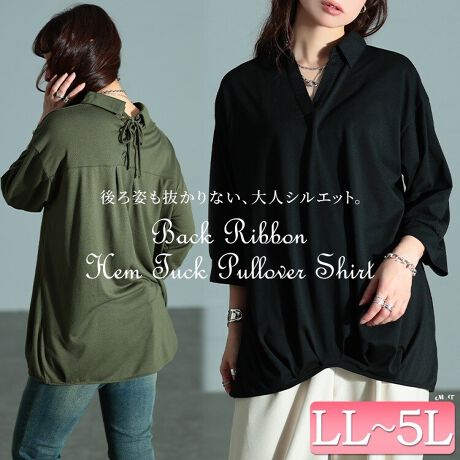 【大きいサイズ】 後ろレースアップ裾タックプルオーバー 大きいサイズ レディース トップス