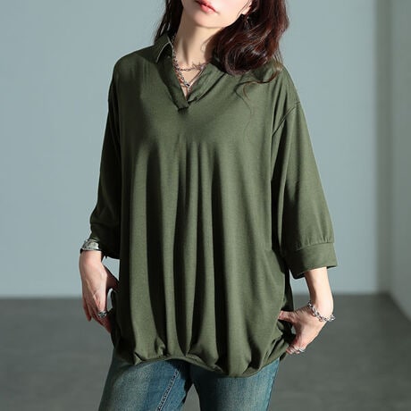 シンプルなプルオーバーシャツは、ラフさがありながらも、綺麗見えする拘りのデザインが魅力。襟の後ろ側にはレースアップデザインをあしらい、後ろ姿もさり気なく愛らしい印象をプラス。柔らかく落ち感のある生地で、美しいドレープを描き、立体感あるシルエットに。程よいラフ感と、きちんと見えの絶妙バランスが魅力的な一着。スキッパーの首元で顔周りをすっきりさせながら大人見えに。裾のタックデザインがふんわりとお腹周りをカバーしつつ、モタつきのないすっきりとした丈感ながら、ヒップをさり気なくカバーしてくれる頼れる一着。