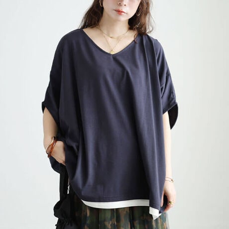 時短でお洒落に!Vネックレイヤード風ドルマンプルオーバー登場☆ラフに着こなせるゆったりシルエットで気になる体型をお洒落にカバー◎ワイドな身幅と抜け感のある首元・袖口デザインで女性らしい華奢感を演出♪主張しすぎずチラリと覗く裾の配色切り替えで重ね着風のアクセントをON☆