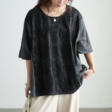 上品に煌びやか、スパンコールレース切り替えプルオーバー。ゆったり着心地のドルマンシルエットで体型をひわない◎前身頃の異素材切り替えで身幅がスッキリ見え着痩せ効果抜群!レディな気分を高めるスパンコールレース使いでコーデが一気に華やぐ♪カジュアル〜綺麗めスタイルまで幅広く着まわしていただけます◎