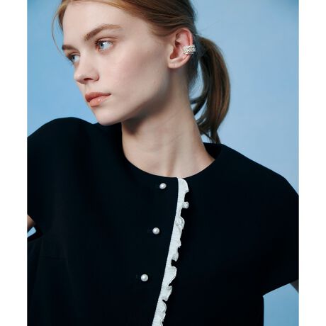 キレイ目なトリアセ混のダブルクロスを使用しています。コンパクトな半袖JKです。前端に細かいプリーツのフリルが二重に挟み込まれており、さらに小さなパール釦でポイントにしています。身頃BKには白いフリルとパール釦でバイカラーでお楽しみ頂けます。身頃アイボリーには同色のフリルと釦が付きます。同素材でスカートとパンツのお作りがありますのでセットアップでもおすすめです。