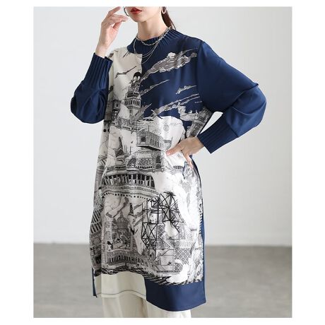 まるでヨーロッパの街並みを思わせるプリントが目を惹くチュニック。エレガントな雰囲気が漂い、さらっと着るだけで気分も華やぎます。旅行コーデにもぴったりな、特別感のある一着です☆