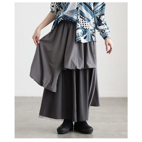 アシンメトリーなデザインが目を惹くスカート。ふんわり広がるフレアシルエットにチュール生地を重ね、軽やかで印象的なスタイルに。シンプルなトップス合わせでもぐっと華やぐ一枚です☆