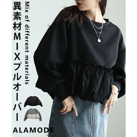 【トップス】 プルオーバー トレーナー 異素材 バルーン ギャザー 長袖 無地 ブラック グレー