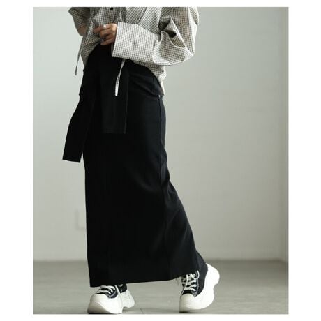 【スカート】 腰巻風 スリム ロング ウエストゴム バックスリット リブカット ブラック 杢グレー