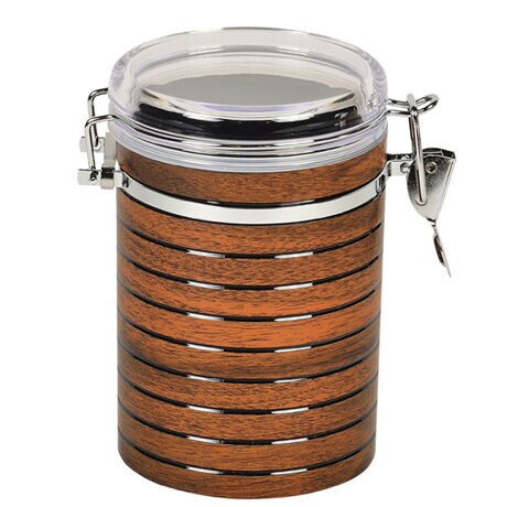 [型番:265542]【デザイン】●コーヒー豆などを湿気から守って保存できるキャニスターです。●パッキン付、ロック式でしっかり密閉できます。●木目のデザインがおしゃれでインテリアにもなります。●便利なスプーン付きです。【スペック】サイズ/約幅14×奥行10.5×高さ15.5cm容量/約800ml内容量/1個材質/本体、ふた、スプーン:AS樹脂パッキン:シリコーンゴム金属部:鉄(クロムめっき) 生産国/台湾製