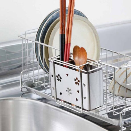 [型番:280099]【デザイン】●桜シリーズのカトラリーポケットです。●水切りかごに掛けて水切りケースとして使用したり、食卓や食器棚でカトラリーケースとして使用することもできます。●丈夫で錆びにくいステンレス製です。●安心してお使いいただける日本製です。【スペック】サイズ/約幅12.7×奥行6.5×高さ10cm重量/約180g内容量/1個材質/本体・底部:18-8ステンレス板部:18-0ステンレス生産国/日本製