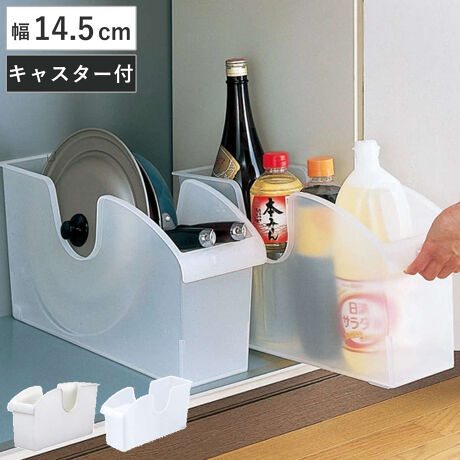 [型番:281442]【デザイン】●調味料から一升瓶まで、しっかり収まるシンク下ボックスです。●後部にコロが付いているので、軽い力で出し入れできます。●かさばるボトル類も奥までしっかり収納できます。●場所をとるフライパンの収納にもおすすめです。●安心安全の日本製です。【スペック】サイズ/約幅14.5×奥行45.7×高さ24.2cm内容量/1個材質/ポリプロピレン種類/ホワイト、クリア生産国/日本製