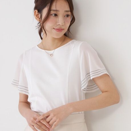 身頃はきれいめジャージ素材で、袖部分にシフォンジョーゼットを使い合わせ、女性らしい動きのあるフレアースリーブに。