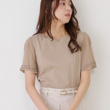 身頃はきれいめジャージ素材で、袖部分にシフォンジョーゼットを使い合わせ、女性らしい動きのあるフレアースリーブに。