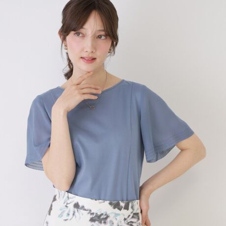 身頃はきれいめジャージ素材で、袖部分にシフォンジョーゼットを使い合わせ、女性らしい動きのあるフレアースリーブに。