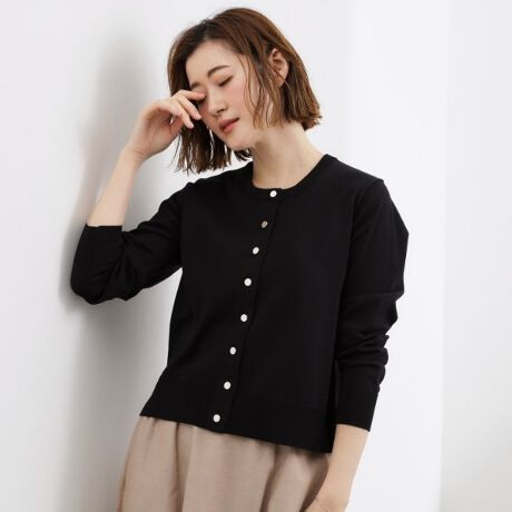 上品な丸首デザインで顔まわりをすっきりと見せるベーシックカーディガン。
