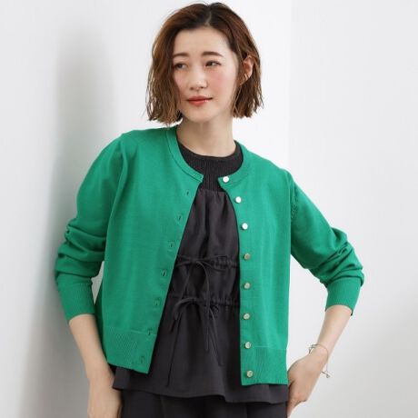 上品な丸首デザインで顔まわりをすっきりと見せるベーシックカーディガン。