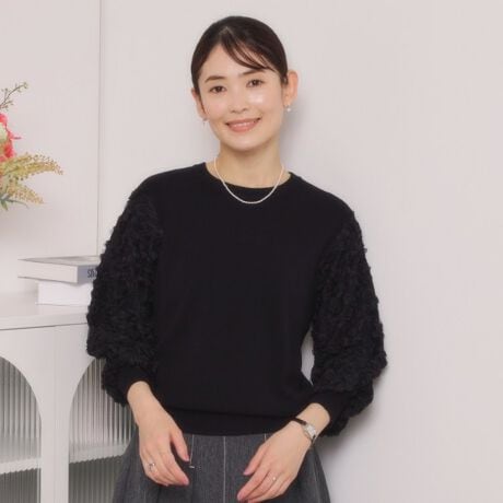 身頃のニットはさらりとしたタッチ感のハイゲージニットできちんと見え。