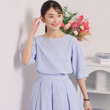 春らしい清涼感あるサッカー素材を使用したブラウス。