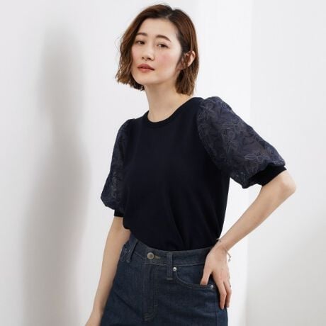 同色シフォンに刺繍を施した袖コンシャスなニットプルオーバー。