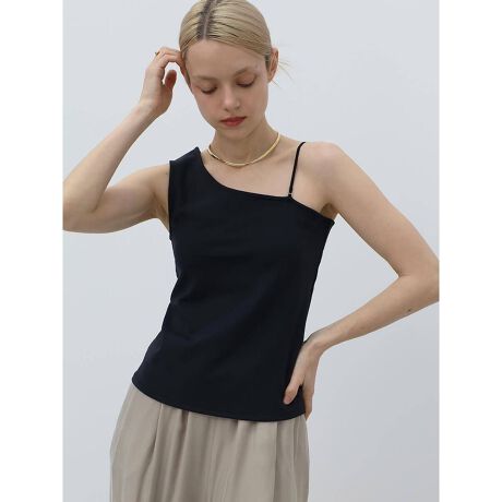 アシンメトリーなショルダーデザインがインパクトのあるデザインインナー。ミニマルなシルエットながら、デコルテをきれいに見せるラインが女性らしい抜け感を演出。ローゲージニットやジャケット、シャツのインナーとしても活躍する着回し力の高いアイテムです。