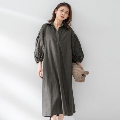 フラワーレースのスリーブを主役に、身頃はすっきりと無地でまとめたコントラストが映えるワンピースです。
