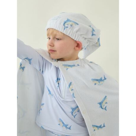 可愛いイチゴと、クールなシャーク柄をプリントした、子どもたちのためのスイムウェアシリーズ。水着と一緒にコーディネート可能な、コットン混素材のふっくらしたKIDS向け吸水タオルです。柔らかなゴム入りで、水遊びの後やお風呂上がりなどにさっと被るだけでドライヤーの時短になります。フロントにさりげなく入ったブランドロゴの刺繍もポイント。色はイチゴ柄のピンクとシャーク柄のブルーをご用意しました。同シリーズのスイムウェアやプールタオルと合わせたり、ギフトにもおすすめです。