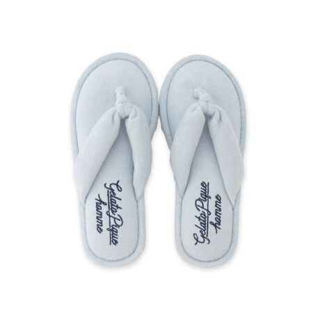 素足にはいても心地良い、柔らかなパイル素材を用いたビーチサンダル風のルームシューズです。ふっくらとした鼻緒とインソールが、1日がんばった足元を心地良くサポート。スタイリッシュな筆記体ロゴのワンポイント刺繍入りです。色は明るいイエローとピンク、涼しげなブルーとネイビーの4色展開。同時期に展開するパイルのルームウェアとコーディネートしたり、ギフトにもおすすめです。