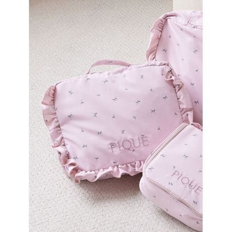 モノグラム柄×リボン、小花柄×フリルの2つのデザインから選べる、夏旅にも便利なトラベルバッグのシリーズです。小さな衣類の収納に便利なMサイズのトラベルポーチ。2段に仕切られた中身は、薄手のトップスやアンダーウェアの収納にちょうど良いサイズ感です。背面には使用済みの衣類を分けて収納できるメッシュポケット付き。フロントにワンポイントでロゴ刺繍が入っています。色はモノグラム柄のアイボリーと小花柄のピンクの2色。同シリーズのバッグやポーチ類と組み合わせて、旅のパッキングにおすすめです。