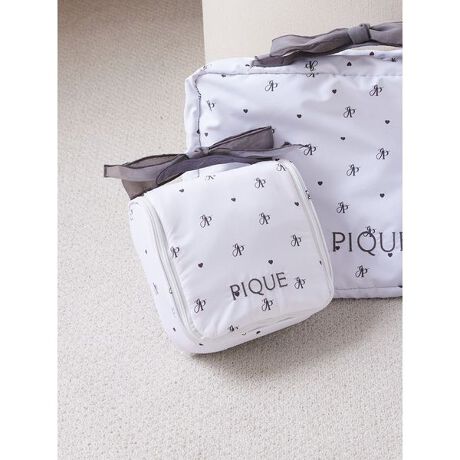 モノグラム柄×リボン、小花柄×フリルの2つのデザインから選べる、夏旅にも便利なトラベルバッグのシリーズです。内側についたループを使用して、旅先のお部屋で180度広げてさっと吊るせるハンギングポーチ。メッシュポケットやファスナーポケットなど内側が細かく分かれているので、スキンケアのボトルやコスメ、衛生用品などをまとめて収納していただけます。フロントにワンポイントでロゴ刺繍も入れました。色はモノグラム柄のアイボリーと小花柄のピンクの2色。同シリーズのバッグやポーチ類と組み合わせて、旅のパッキングにおすすめです。