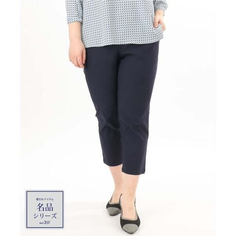 フロントウエストゴムのギャザーデザインが気になるお腹まわりを自然にカバーし、計算されたタック位置が縦ラインを強調してすっきり見せます。