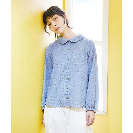 ポリエステル生地にエンボス加工を施し、凹凸感を加えたブラウス。シワを気にせずお召しいただけイージーケアなのも嬉しいポイントです。
