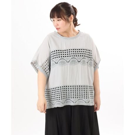 かぎ針編みと綿混のブラウス生地を組み合わせた、ナチュラルでカジュアルな印象のブラウス。