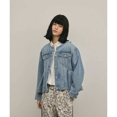 カジュアルなデニムジャケットを女性らしく昇華した一枚。厚すぎず薄すぎない春に着やすい11オンスの加工映えするデニムを使用した、本格的な表情が魅力の一品です。抜け感をもたらすノーカラーデザインに仕上げる事で、襟付きの定番のGジャンとはまた違った新鮮な表情に仕上がっています。サイドに施した可憐なペプラムシルエットで女性らしいニュアンスをプラス。ペプラムはボタンの着脱で調整もでき、お好みでシルエットの変化もお楽しみいただけます。袖周りはゆったりと落としたドルマン型にし、バサッとラフに羽織っておしゃれに決まるバランスに。春の訪れと共に着たい、スイッチシーズンにぴったりなアイテムに仕上がりました。