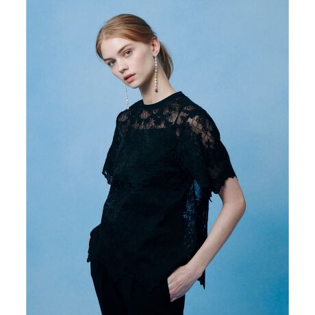 オーガンジーに刺繍を施した生地を、着やすいTシャツ型に落とし込みました。スカラップを最大限に生かしたデザインで、真夏にさらっと着れるアイテム。裏は縫い代を全てや柔らかいチュールで始末しており肌アタリも気になりません。
